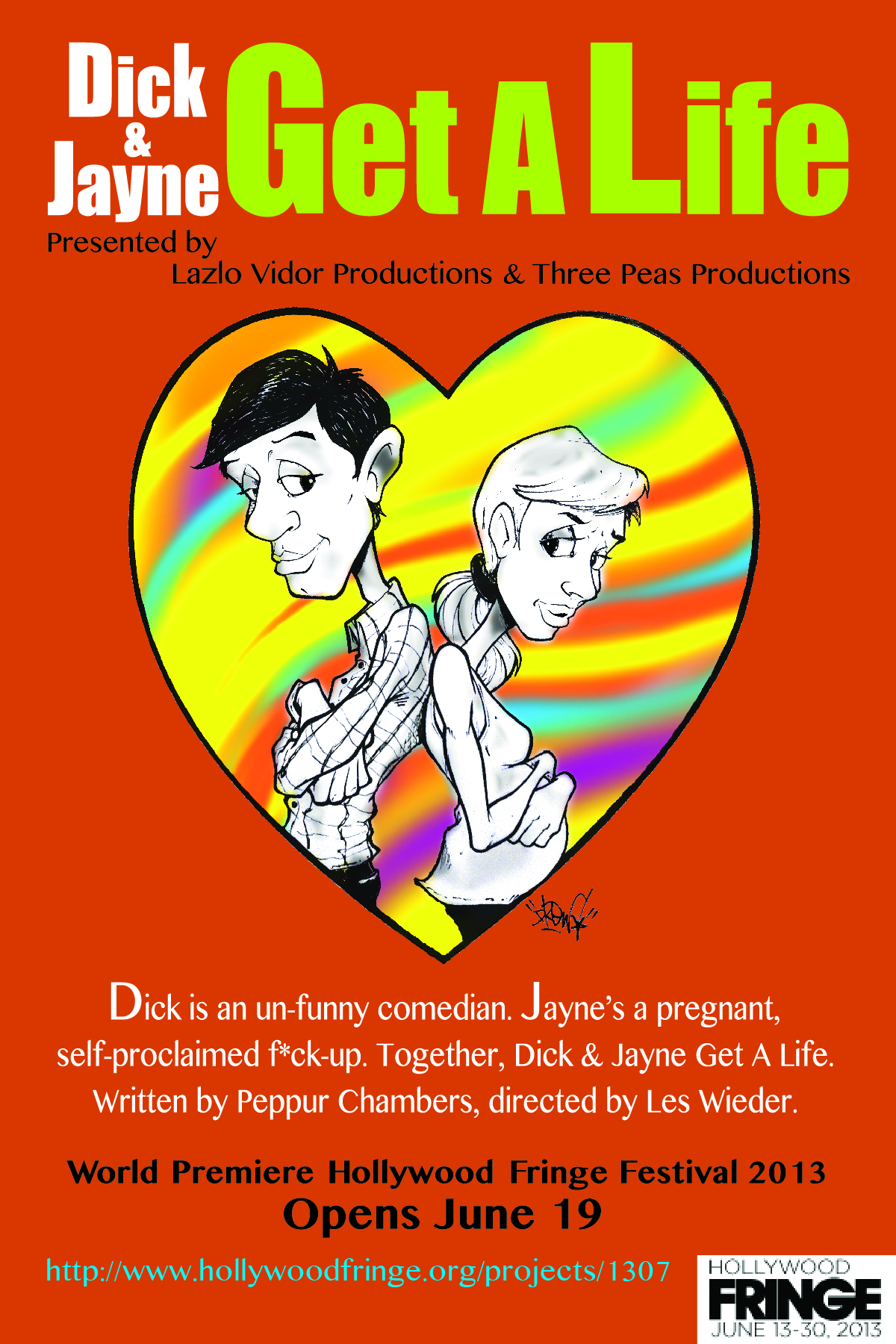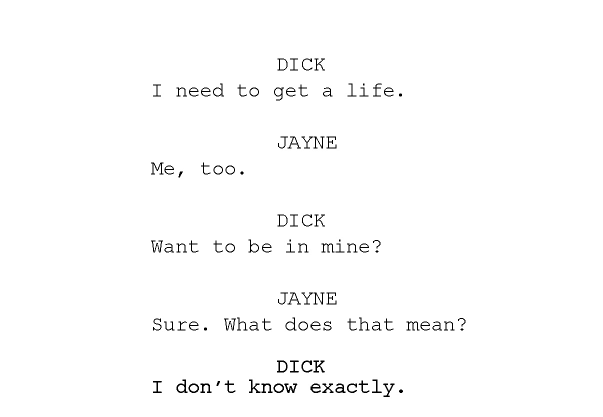 With his already horrible comedy career on the line due to a failed relationship, Dick’s manager implores him to find the funny or never come back to the comedy club. Dick feels he can only be funny if he has a girlfriend. Enter Jayne. Pregnant by Asshole Alex, broke, scared and faced with a decision, she is on the verge of a nervous breakdown. Jayne finds comfort in the warped, gallant arms of Dick and Dick finds comfort in the symmetry of their names. Together, Dick & Jayne Get A Life.